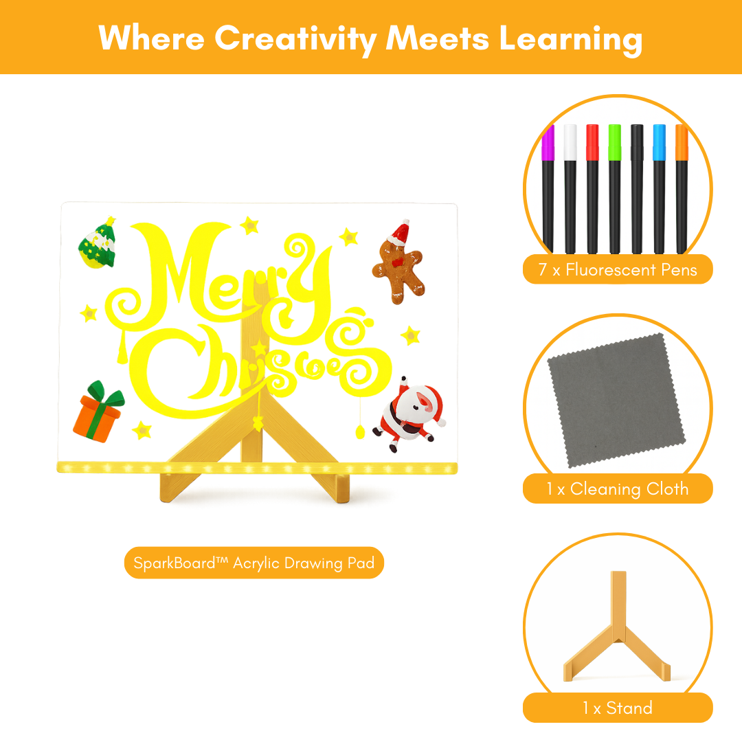 Each SparkBoard™ comes with the acrylic drawing pad, 7 fluorescent pens, and a cleaning cloth so you can start using it right out of the box.