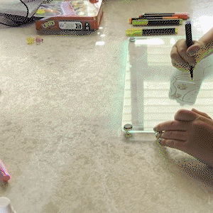 The SparkBoard™ uses built-in LED lights along the edges of the board that illuminate your drawings when switched on. This creates the glowing effect with the fluorescent pens.